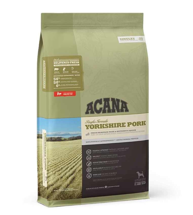 Az ACANA Yorkshire Pork a húsok mellet tartalmaz belsőségeket és porcokat, megfelelve az EgészPréda táplálási koncepciónak, így a tápanyagokat döntően természetes formában kapja meg a kutya, ezért radikálisan csökkenthető a felhasznált táplálék-kiegészítők száma.