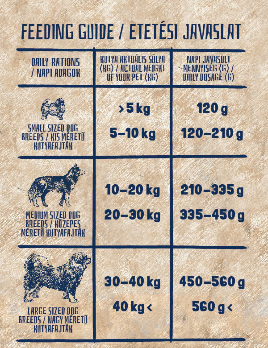 Összetétel: Hús és állati származékok (bárányhúsliszt min.4%, Sertéshúsliszt min.29%), búza, korpa, cirok, állati zsír, burgonya, rizs, tök (1%), F.O.S.
