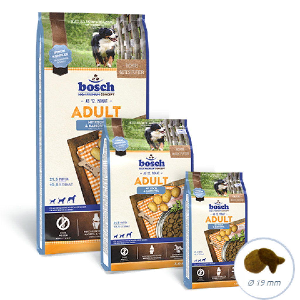 A Bosch Adult Fish & Potato kiváló szárazeledel normál aktivitású felnőtt kutyáknak. A halhús gazdag omega 3 és omega 6 eszenciális zsírsavakban az egészséges bőrért és a fényes szőrért. A burgonya gyomorkimélővé és könnyen emészthetővé teszi a tápot.