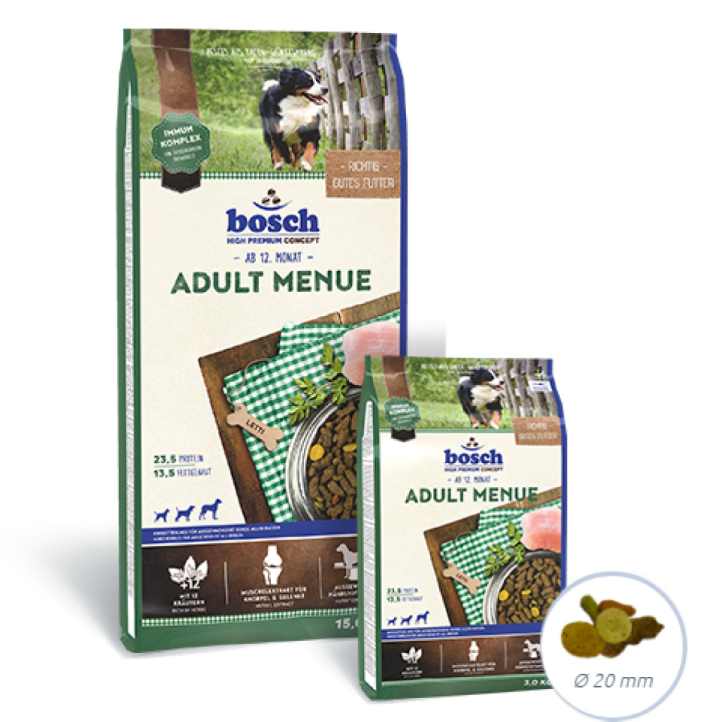 A Bosch Adult Menu különböző fehérje és zöldségkrokettek finom fűszerekkel ízesített keveréke normál aktivitású felnőtt kutyáknak. Speciális fűszer kompozíció értékes zöldségkeverékkel, gyomorkímélő és bélstabilizáló cikóriasalátával.