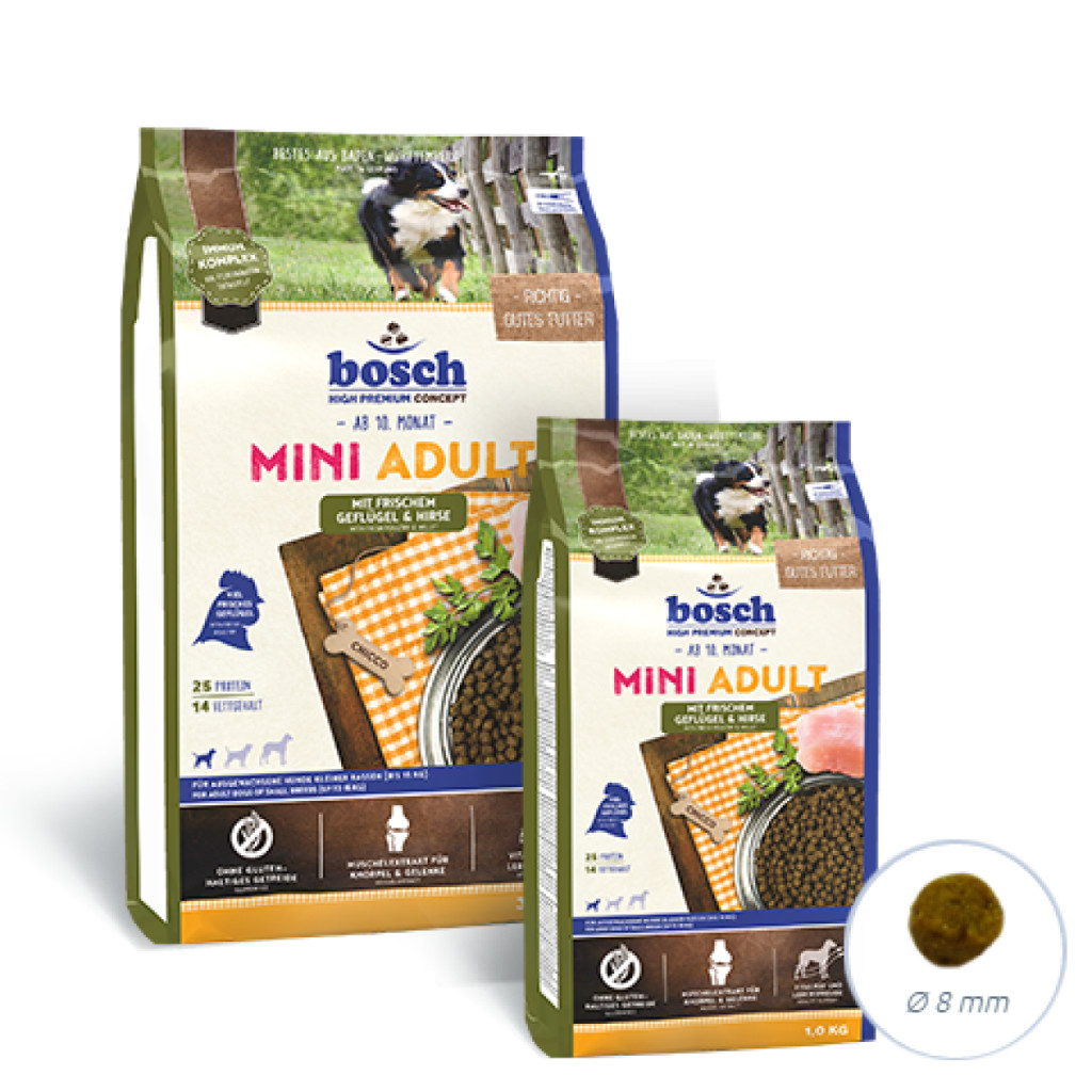 A Bosch Mini Adult Poultry & Spelt kiváló szárazeledel normál aktivitású felnőtt kutyáknak. Érzékeny emésztőrendszerű, táplálékérzékeny kistestű kutyáknak is.