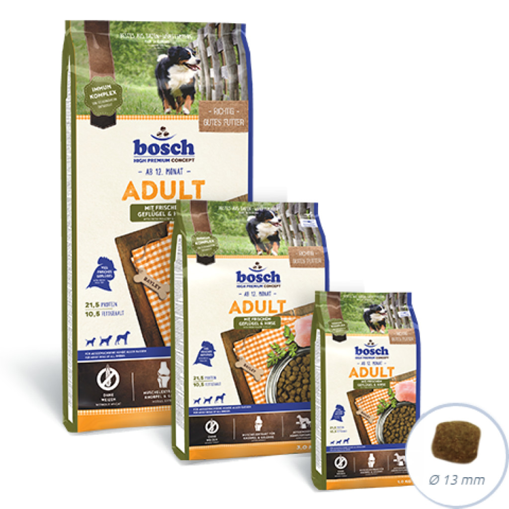 A Bosch Adult Poultry & Spelt kiváló szárazeledel normál aktivitású felnőtt kutyáknak. Érzékeny emésztőrendszerű, táplálékérzékeny kutyáknak is.