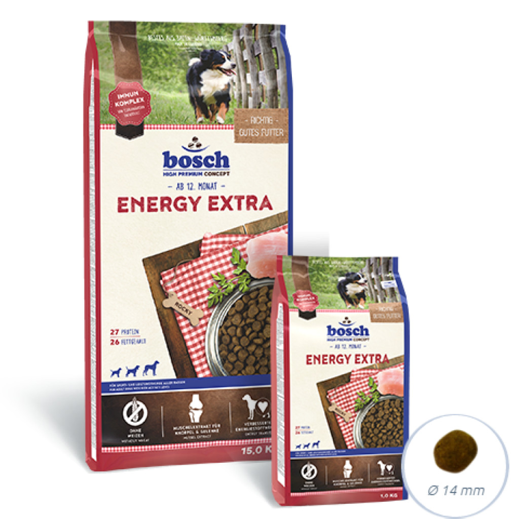 A Bosch Energy Extra kiváló szárazeledel extrém igénybevételnek kitett, nagy teljesítményt nyújtó kutyáknak (sport, agility, kiképzés alatt álló kutyák, munkakutyák).