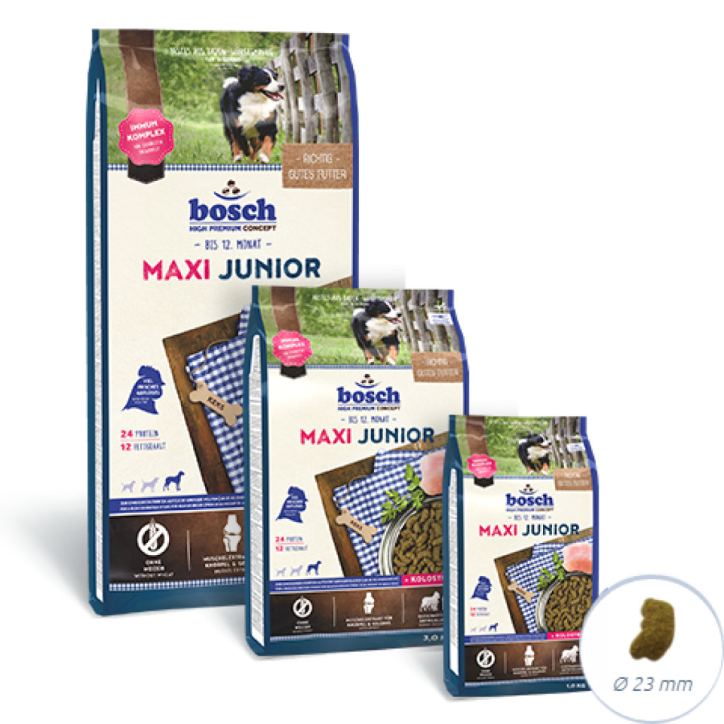 A Bosch Maxi Junior kiváló nevelőtáp (25kg-os kifejlett súly fölött) nagytestű kölyökkutyáknak, a kölykök szükségleteihez igazított krokettformával, mérettel valamint a szükséges fehérje és ásványianyag tartalommal.