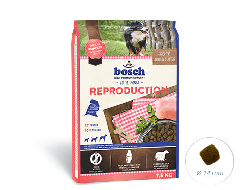 A Bosch Reproduction speciális szárazeledel vemhes és szoptató szukáknak. Specifikus összetételével gondoskodik a szoptató szukák folyamatos tejképződéséről, hogy optimális fejlődést biztosítson a kölykök számára. Könnyű emészthetősége a szuka számára elegendő tápanyagfelvételt biztosít a szoptatási időszakban.