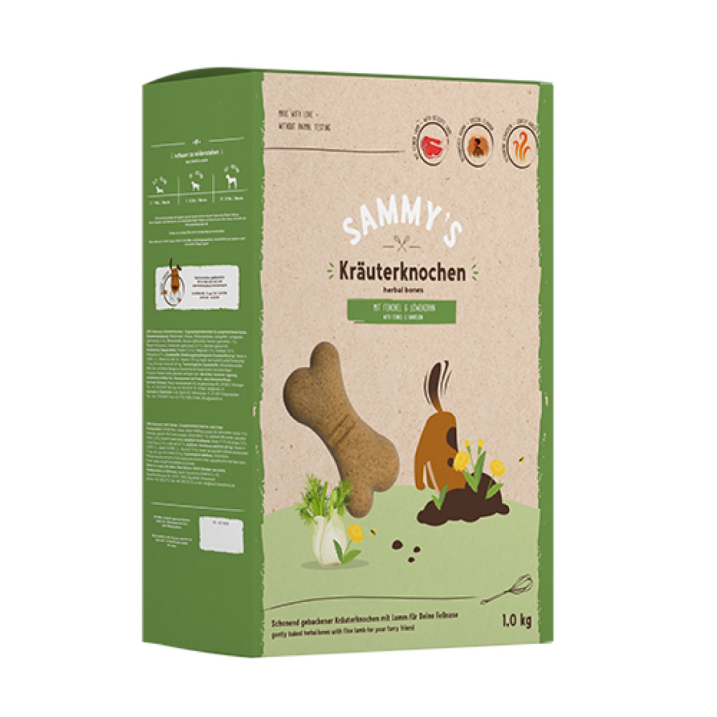 A csont alakú snack többek között ízletes bárányból készül, valamint válogatott gyógynövényeket is tartalmaz. A pitypang és az édeskömény különleges aromát kölcsönöz ennek a csemegének. A Sammy‘s gyógynövényes csontot kíméletesen, sütőben készítik. Németországban, szigorú minőségi követelmények szerint gyártják.