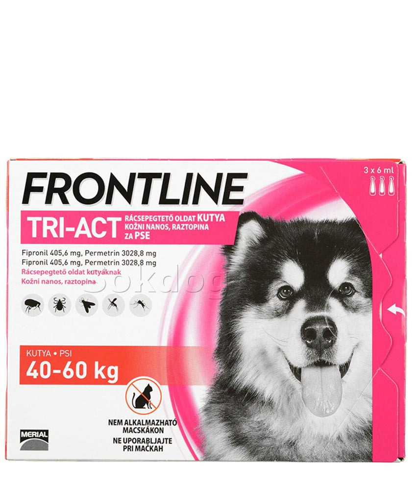A Frontline Tri-Act rácsepegtető oldat kutyáknak egy repellens hatású készítmény, óriástestű kutyákra. Kullancs, bolha, szúnyog, lepkeszúnyog, szuronyos istállólégy ellen.