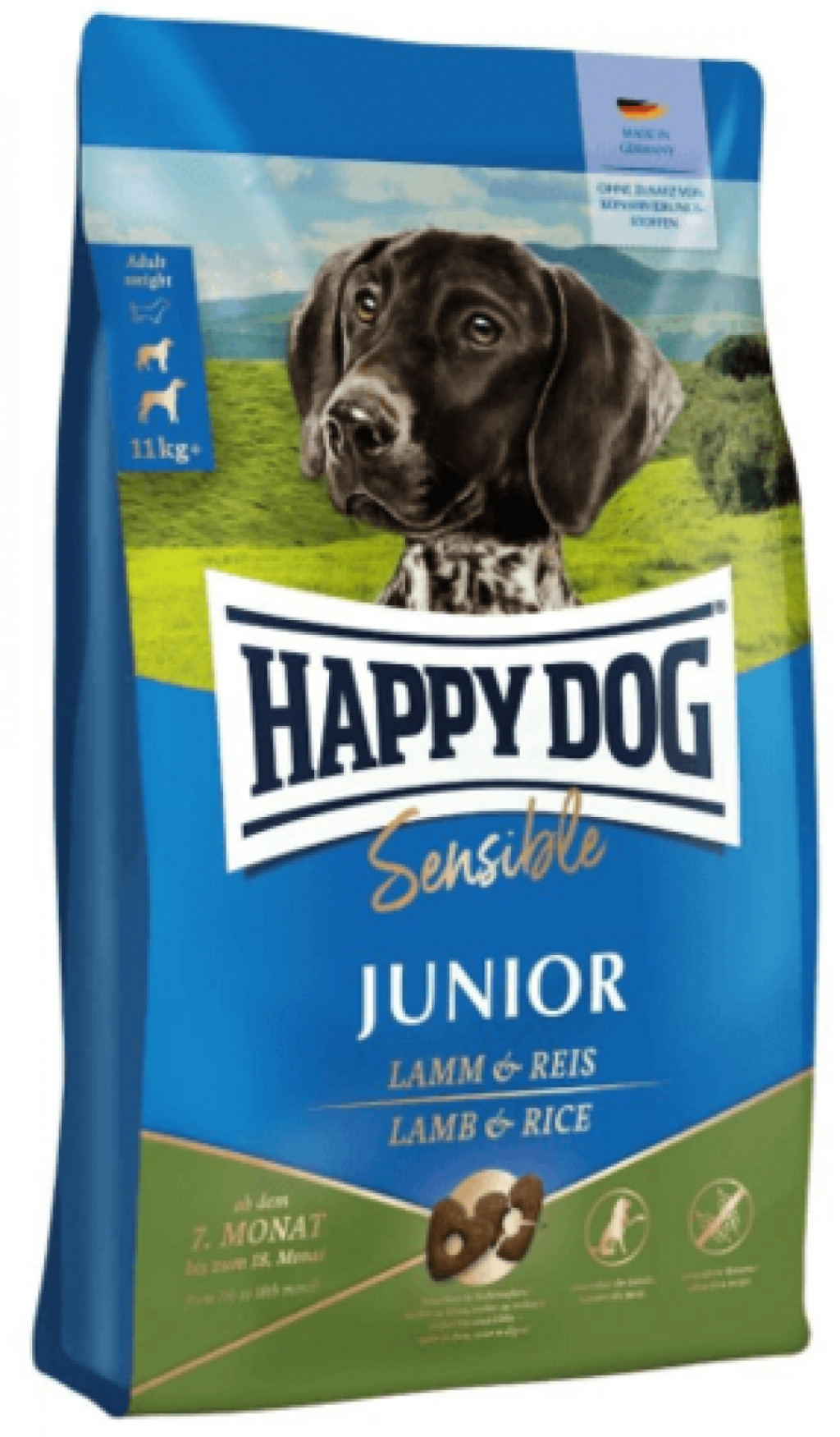 A Happy Dog Sensible Junior Lamb & Rice egy teljesértékű eledel normál energiaszükségletű közepes- és nagytestű fiatal kutyák számára 7 hónapos kortól 18 hónapos korig.