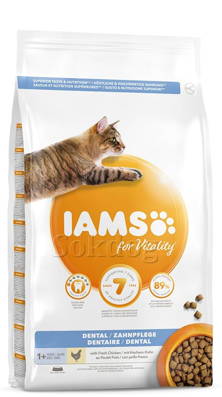 Az IAMS for Vitality Dental táp friss csirkehússal felnőtt és idős macskáknak készült, 100%-ban teljes értékű és kiegyensúlyozott szakértő táplálék, mely támogatja macskája egészséges vitalitásának 7 jelét, hogy gondoskodjunk a fogak egészségesen és erősen tartásáról. Mindez ízletes receptúra formájában, 89% állati fehérjével (az összes fehérjéből), hogy kedvence minden nap élvezettel fogyassza.