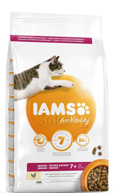 Az IAMS for Vitality eledel friss csirkével idős macskáknak készült, 100%-ban teljes értékű és kiegyensúlyozott szakértő táplálék, mely támogatja macskája egészséges vitalitásának 7 jelét, hogy Ön csodálhassa ragyogó bundájukat és egészséges bőrüket. Mindez ízletes receptúra formájában, 88% állati fehérjével (az összes fehérjéből), hogy kedvence minden nap élvezettel fogyassza.