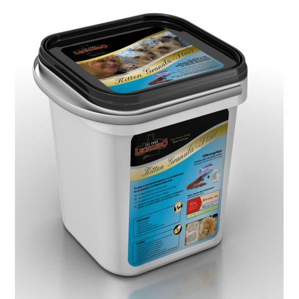 Teljesértékű macskaeledel, az elválasztás időszakára. Az ideális méret (0,2 - 0,4 cm-es pormentes granulátumok) kiváltképp zökkenőmentes átállást biztosít a kölyökmacskák tejmentes táplálására, már 3 hetes kortól. Tejjel vagy vízzel elkeverve egy igazán ízletes pépet kapunk. Ideális hússal vagy LEONARDOŽ Kittennel vegyítve etetni. Etetési javaslat: 3:1 arányban 40 °C -os vízzel keverve. Összetétel: fehérje: 34%, zsír: 22% Összes állati fehérje: 90% (80% baromfi, 10% hal) PROVITAL: az immunrendszer természetes erősítője (Beta-Glucane) STAYCLEAN: a fogkőképződés csökkentésének érdekében. Nem tartalmaz színezéket, ízfokozót és tartósítószert sem. Búza és szója mentes.