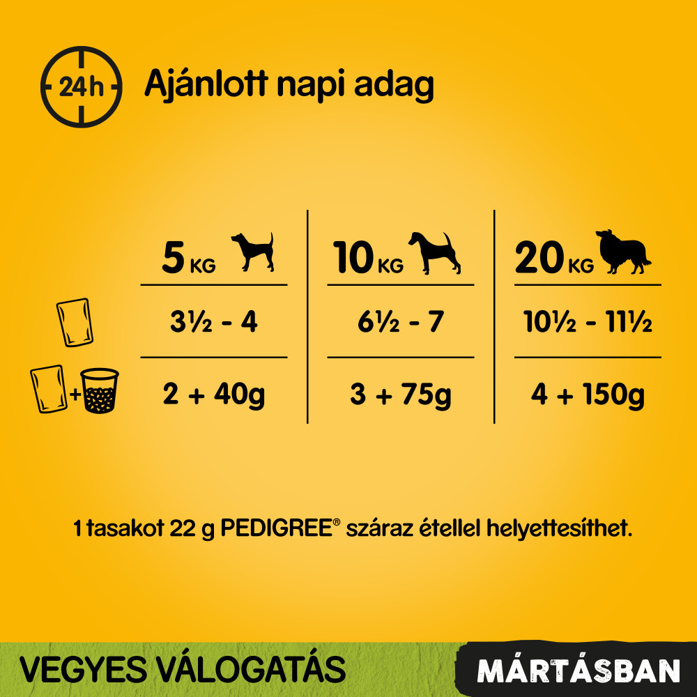 Csirke: hús és állati származékok (35%, természetes* 93%; ebből csirke 14% és sertésmáj 9% a falatokban**), válogatott gabonafélék, zöldségek (ebből szárított sárgarépa és borsó keveréke 0,8%, ami sárgarépa és borsó keverékével egyenértékű 4%), növényi fehérje kivonatok, növényi eredetű származékok* (ebből szárított répapép 0,8%), olajok és zsírok, ásványi anyagok (0,6%), Marha és máj keverék: hús és állati származékok (35%, természetes* 93%; ebből marha 6% és sertésmáj 9% keveréke a falatokban**), válogatott gabonafélék, zöldségek (ebből szárított sárgarépa és borsó keveréke 0,8%, ami sárgarépa és borsó keverékével egyenértékű 4%), növényi fehérje kivonatok, növényi eredetű származékok* (ebből szárított répapép 0,8%), olajok és zsírok, ásványi anyagok (0,6%), Pulyka: hús és állati származékok (35%, természetes* 93%; ebből pulyka 14% és sertésmáj 9% a falatokban**), válogatott gabonafélék, zöldségek (ebből szárított sárgarépa 0,6%, ami egyenértékű sárgarépával 4%), növényi fehérje kivonatok, növényi eredetű származékok* (ebből szárított répapép 0,8%), olajok és zsírok, ásványi anyagok (0,6%), Marha és bárány keverék: hús és állati származékok (35%, természetes* 93%; ebből marha 7%, bárány 7% és sertésmáj 9% keveréke a falatokban**), válogatott gabonafélék, zöldségek (ebből szárított sárgarépa 0,6%, ami egyenértékű sárgarépával 4%), növényi fehérje kivonatok, növényi eredetű származékok* (ebből szárított répapép 0,8%), olajok és zsírok, ásványi anyagok (0,6%), *természetes összetevők, **a termék rendszerint 45%-ban tartalmaz falatkát