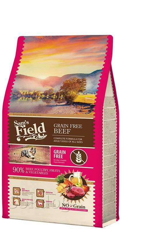 A Sam's Field Adult Grain Free Beef egy teljesértékű állateledel felnőtt kutyák számára.
