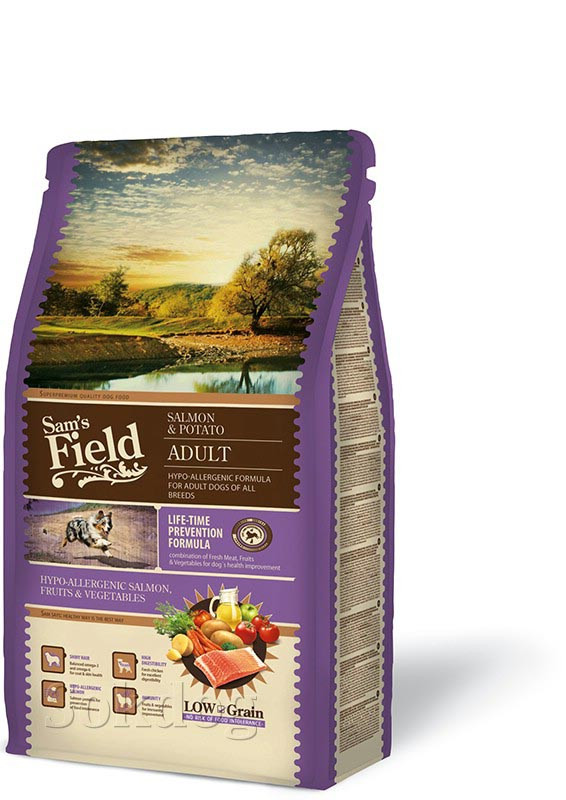 A Sam's Field Salmon & Potato Adult egy teljesértékű állateledel, valamennyi fajtájú felnőtt kutya számára.