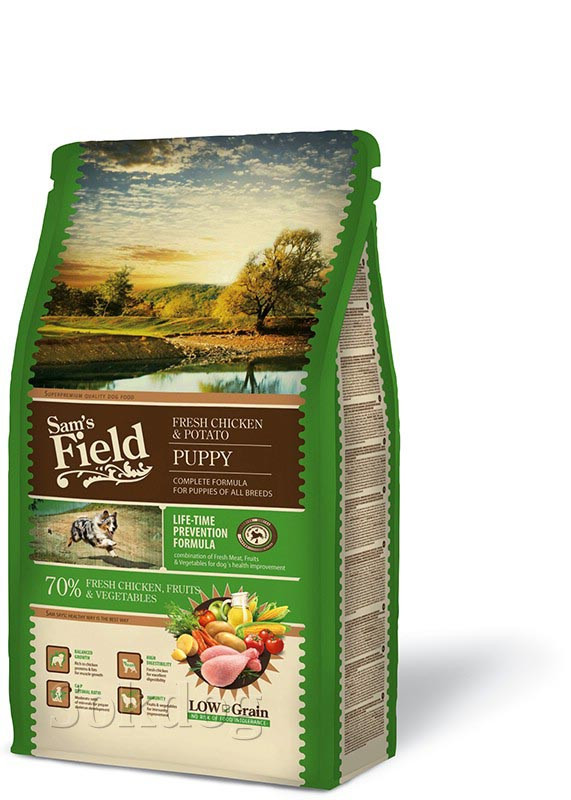 A Sam's Field Fresh Chicken & Potato Puppy egy teljesértékű állateledel, valamennyi fajtájú kölyök kutya számára.