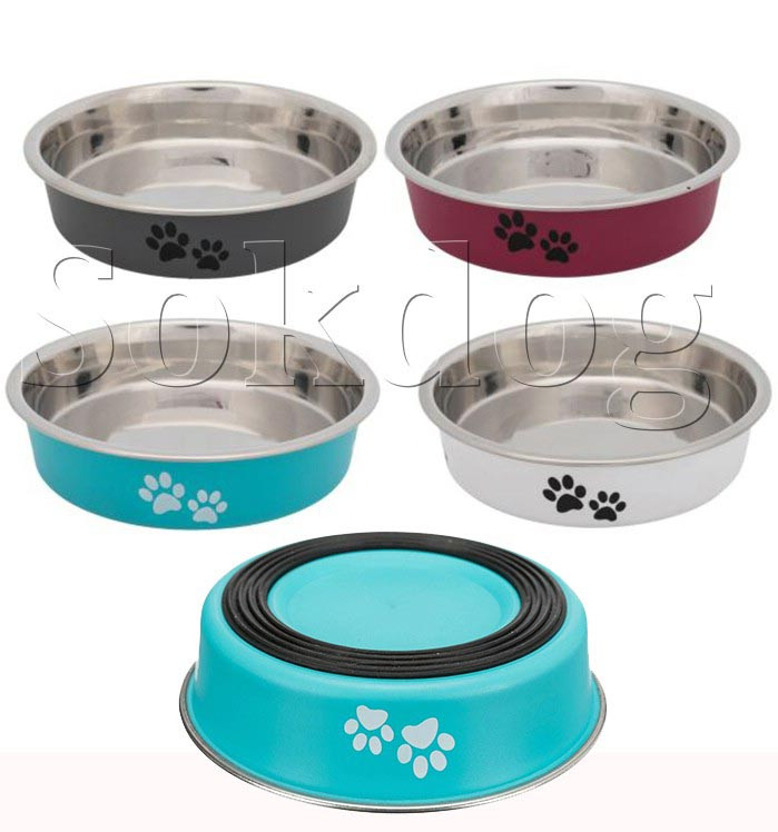 Rozsdamentes acél alacsony tálka kívül plasztik bevonattal, rövid orrú cicáknak, és kistestű kutyáknak. Praktikus csúszásgátló gumitalppal.