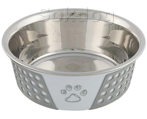 Elegáns ezüstszürke szilikonbeconatos rozsdamentes acél tál oldalán mintával, csúszásgátló szilikontalpakkal.